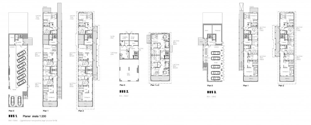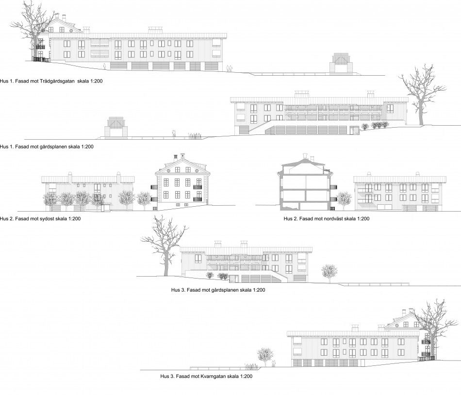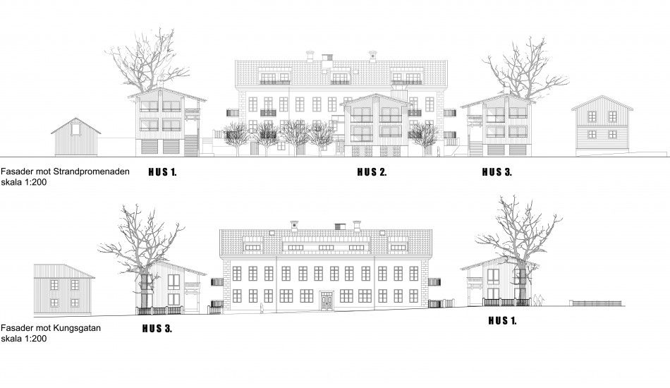 Vi har ritat ett hus på var sida om skolan, samt ett dem emellan. Husen vid sidan av skolan ligger i sidogatornas gatuliv. Tanken är att fortsätta på, och laga stadens struktur. Men de bägge yttre husen är tillbakadragna från Kungsgatan för att spara de stora träden samt ge lägenheterna i fd skolan bättre utsikt. Enligt stadens arkitektur borde husen gå ända upp till hörnen av tomten, men vi har gjort det avsteget. De yttre husen har röd slamfärgad panel som en inramning av kvarteret, huset i mitten är ljust med träpanel målad i en bruten vit kulör. Tillsammans ger de tre husen en bostadsyta på 1300m2.Husen är upplyfta på plintar eller pelare, och där på markplanet finns entréer och garage. Vi tycker inte att man behöver dölja det faktum att husen behöver lyftas upp; det påminner om en hamnbebyggelse med hus stående i eller nära vattnet med tåliga material där de är som mest utsatta. Mellan pelarna finns en glespanel som skyddar mot snödrev men låter luften svepa fritt. I det mittersta huset har detta utrymme i markplan istället fått ge plats för kanotupplag för kvarterets kommande roddarklubb.