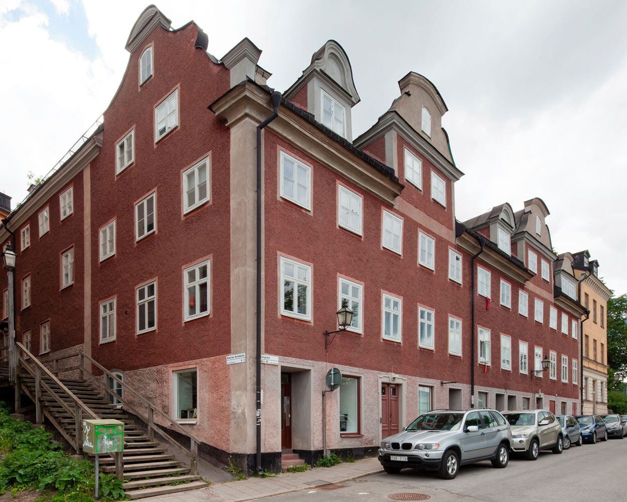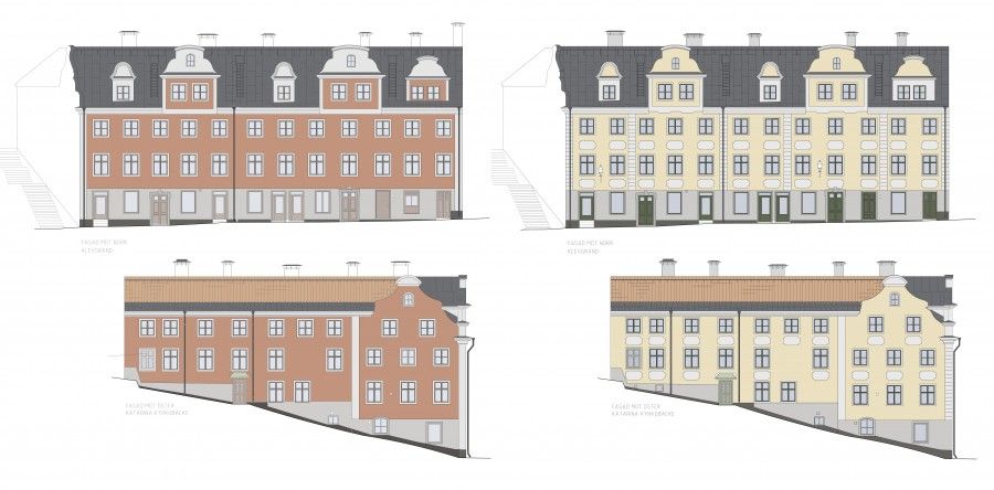 FASADRENOVERINGEN Den föregående fasadrenoveringen utfördes 1959. Fasaderna mot Klevgränd och Katarina kyrkobacke putsades då med en röd spritputs. Putsbruket var ett kalkcementbruk och genomfärgat med järnoxid (typ Falu rödfärg). Pigmentmängden var mycket stor för att erhålla den djupröda kulören. Detta bidrog till att bruket blev svagt. Efter drygt femtio år var fasadputsen uttjänt. Delar hade eroderat bort, större ytor var förgipsade och det röda pigmentet hade runnit ned på fönsteromfattningar och sockel. Putsbruket på sockelvåningen mot Klevgränd är var med kalkputs och har klarat sig mycket bättre än fasadputsen. Inför den nu genomförda renoveringen togs beslutet att befintlig puts skulle knackas ned och att fasaderna skulle putsas om med en äkta kalkputs och därefter avfärgas med järnvitriol. Putsarbetet utfördes av Tremans Fasad AB från Hedemora.