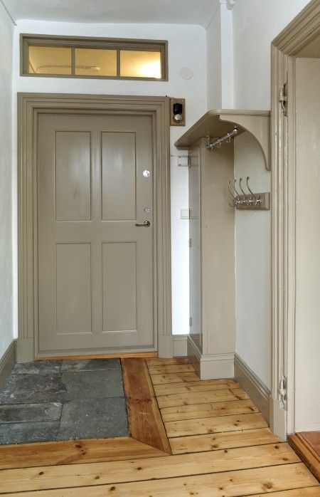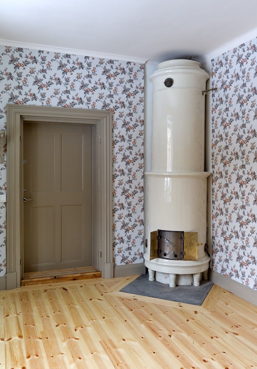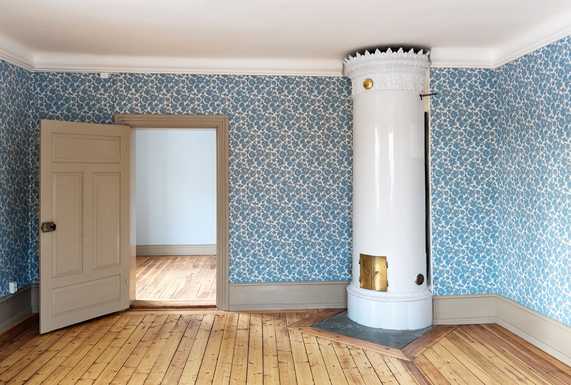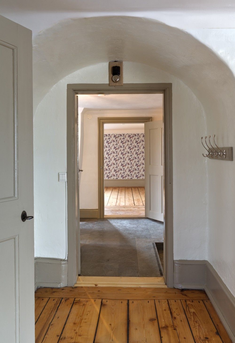 flagnande färg och snickerier generellt i behov av renovering och ommålning alternativt byte i sin helhet.Vid den första inventeringen noterades det att flertalet av de murade väggarna hade påbyggnadsväggar i form av läkt, träpanel och ytterst ett tapetserat skivmaterial. För att kvalitetssäkra den fortsatta projekteringen påbörjades en varsam rivning av ej skyddsvärda delar vilket gav en unik möjlighet för arkitekt och ansvarig antikvarie att inventera varje rum och byggnadsdel i minsta detalj inför upprättande av förfrågningsunderlaget. Dold under panel och skivmaterial återfanns delar av gamla tapetlager, profilerade putsade taklister och även golvsocklar. Detta gav oss en fingervisning om vilken årsring som skulle råda i renoveringen och på så sätt bidra till att berätta om husets historia. I praktiken så blev renoveringen i flera delar en restaurering av kulturhistoriskt värdefulla byggnadsdelar och detaljer som legat dolda i mer än ett halvt sekel. Där delar av äldre tapet återfanns pappspändes väggarna för att bevara skikten till framtida generationer. Nya tapeter valdes med de äldre som förebild.