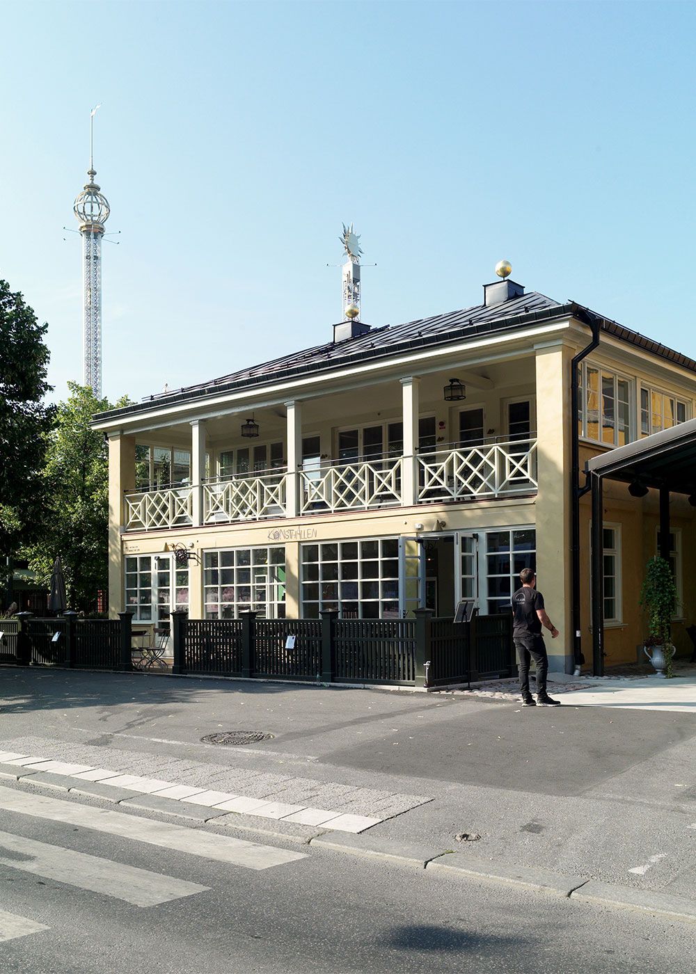 Uteserveringen mot Djurgårdsvägen inramas av ett trästaket utformat efter 1928 års förlaga. Åt Allmänna gränd har uteserveringens stålstaket från sent 1980-tal ersatts med ett lätt trästaket med kryssmotiv.