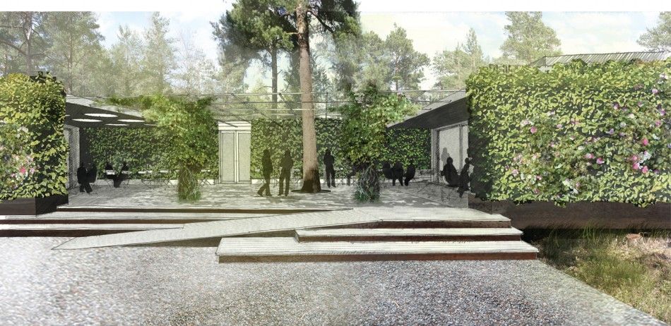 Anna gömmer sig bakom en häck av avenbok med inslag av rosor. Häckarna är formklippta och bildar husets synliga fasad. De växer i kar av kortenstål som konsolerar från grundläggningsplintarna, och med en distans till marken. Taken är med sedum dels för inneklimat och dels för att den som rör sig i skogen ovanför byggnaden, eller bor i stugorna, även fortsättningsvis skall se gräs och mossa i utblicken mot slottet.GÅRDEN