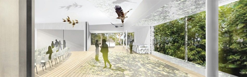 OM NATTEN GLIMMAR LJUSET - från restaurang och naturum genom lövverket.BYGGNADEN FÖRHÅLLER SIG TILL OMGIVNINGEN