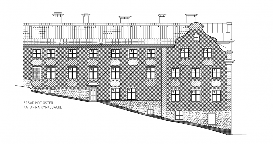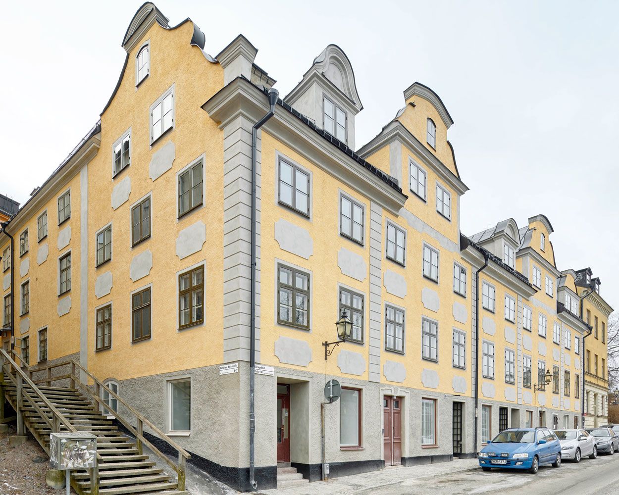 FASADRENOVERINGEN Den föregående fasadrenoveringen utfördes 1959. Fasaderna mot Klevgränd och Katarina kyrkobacke putsades då med en röd spritputs. Putsbruket var ett kalkcementbruk och genomfärgat med järnoxid (typ Falu rödfärg). Pigmentmängden var mycket stor för att erhålla den djupröda kulören. Detta bidrog till att bruket blev svagt. Efter drygt femtio år var fasadputsen uttjänt. Delar hade eroderat bort, större ytor var förgipsade och det röda pigmentet hade runnit ned på fönsteromfattningar och sockel. Putsbruket på sockelvåningen mot Klevgränd är var med kalkputs och har klarat sig mycket bättre än fasadputsen. Inför den nu genomförda renoveringen togs beslutet att befintlig puts skulle knackas ned och att fasaderna skulle putsas om med en äkta kalkputs och därefter avfärgas med järnvitriol. Putsarbetet utfördes av Tremans Fasad AB från Hedemora.