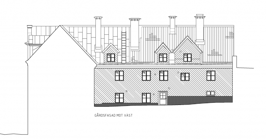 GÅRDEN OCH DEN NYA TVÄTTSTUGAN. Före renoveringen var gården en stor och sluttande asfaltsyta. I kanterna mot den stora stödmuren i norr fanns eftersatta planteringar och ett par träd. Mitt på gården var en träterrass byggd för att få en plan yta att sitta på. Den nu genomförda gårdsgestaltningen är helt modern men kommer ur en rad tekniska förutsättningar. Ytan närmast husen är underbyggd av en källare. Gårdsbjälklaget över denna är så tunt att ingen ytterligare last bör påföras. För att bromsa upp regnvattnet har gården terrasserats i olika nivåer. På så sätt skapas jordmagasin som kan bromsa regnvattnet. Marken närmast husen har fått en yta av kvastad betong medan resten av gården har kalksten, gräs och buskar. I gårdens sydvästra hörn har en ny tvättstuga och förrådsbyggnad uppförts. Tidigare fanns tvättstuga i källaren men efter förstärkningen av gårdsbjälklaget var det inte längre en lämplig placering. Den nya tvättstugan är uppförd på den del av gården som var bebyggd med bostadshus fram till 1940-talet. Detta hörn av gården är svåranvänt för andra ändamål då det alltid ligger i skugga. Tvättstugan är murad och putsad med kalkputs. Avfärgningen är densamma som för fasaderna, det vill säga med järnvitriol. En tanke med tvättstugan är att den, förutom att vara funktionell, ska smälta och bli ett tillskott till gårdsmiljön. Den har lånat sin form med det brutna taket från den typ av komplementbebyggelse som finns på södergårdar. Fönstren har gjorts större än vanligt för att släppa in rikligt med ljus men även tydliggöra att det här är ett hus från vår tid, en ny årsring till kvarteret.