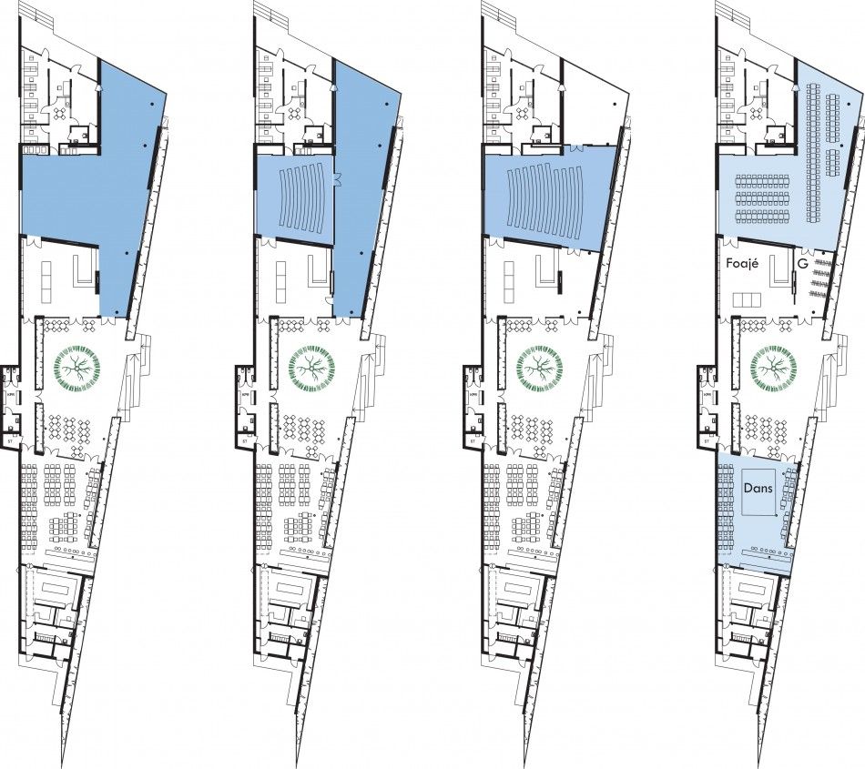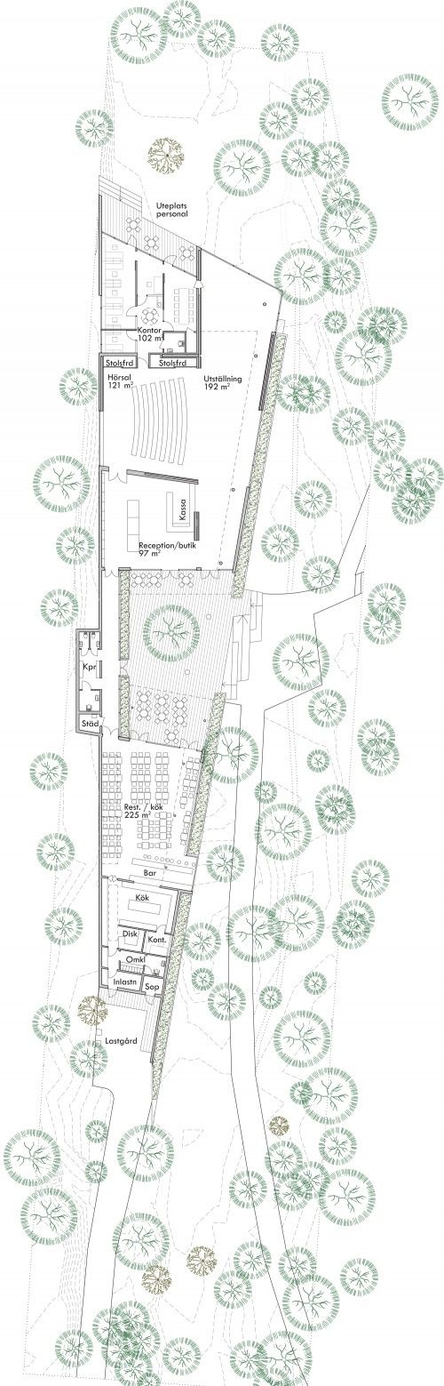 Restaurangen är helt glasad mot gården och mot öster. Den östra sidans glas kommer att ge en utblick mot häcken vilket gör hela denna vägg till en grön vägg. Vid bardisken bildar väggen ett burspråk med utblick mot vattnet. Längs den västra väggen finns lanterniner som ger överljus. Restaurangen rymmer det efterfrågade antalet platser. Köket är placerat i byggnadens sydligaste del för att kunna nås med transporter via en egen väg för att inte promenerande besökare skall störas, samt att det ger möjlighet till kökstransporter under hela dagen. Kylt soprum finns i anslutning till lastbryggan mot den lastgård som bildas mellan häckens förlängning och berget i öster. På lastgården finns plats för sorteringskärl för torra sopor.UTSTÄLLNINGSRUMMET