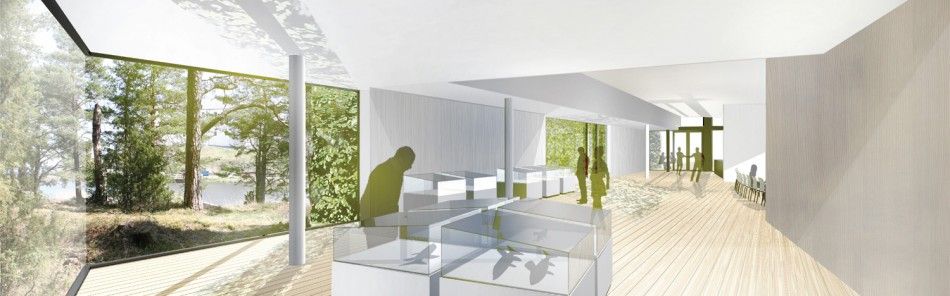 Utställningen når man antingen direkt från gården eller via receptionen. Skjutbara väggar mellan reception och utställningsdel gör att öppenheten dem emellan kan ökas eller minskas. Utställningsrummet med sin koniska planform kan delas in i tre rum genom skjutbara väggskivor som magasineras inne i de fasta väggarna. Besökaren får här uppleva det silade ljuset genom häcken och se solreflexerna som bildas mellan löven dansa på golvet. Längst fram i utställningen öppnar sig rummet mot utsikten med stora glasade partier. Rummet har en lägre zon utmed fasaden med en rumshöjd av 2.8 meter. För att kompensera den lägre takhöjden är rummet drygt 4 meter i sin centrala del.HÖRSALEN