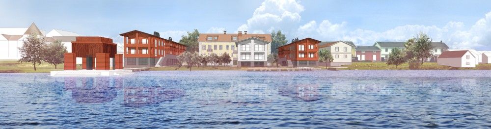 Vi har ritat ett hus på var sida om skolan, samt ett dem emellan. Husen vid sidan av skolan ligger i sidogatornas gatuliv. Tanken är att fortsätta på, och laga stadens struktur. Men de bägge yttre husen är tillbakadragna från Kungsgatan för att spara de stora träden samt ge lägenheterna i fd skolan bättre utsikt. Enligt stadens arkitektur borde husen gå ända upp till hörnen av tomten, men vi har gjort det avsteget. De yttre husen har röd slamfärgad panel som en inramning av kvarteret, huset i mitten är ljust med träpanel målad i en bruten vit kulör. Tillsammans ger de tre husen en bostadsyta på 1300m2.Husen är upplyfta på plintar eller pelare, och där på markplanet finns entréer och garage. Vi tycker inte att man behöver dölja det faktum att husen behöver lyftas upp; det påminner om en hamnbebyggelse med hus stående i eller nära vattnet med tåliga material där de är som mest utsatta. Mellan pelarna finns en glespanel som skyddar mot snödrev men låter luften svepa fritt. I det mittersta huset har detta utrymme i markplan istället fått ge plats för kanotupplag för kvarterets kommande roddarklubb.
