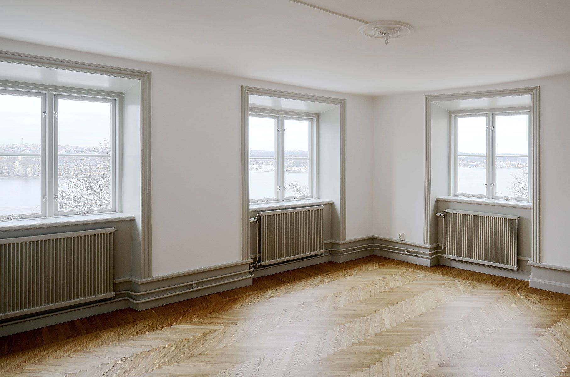 INVÄNDIGA ARBETEN Under renoveringen har samtliga ytskikt renoverats. Metoder och material har varit traditionella så långt det har varit möjligt. Snickerier är målade med linoljefärg och tak med limfärg. Väggarna har tapet eller målade efter hyresgästens val. I köken har så mycket som möjligt av inredningen från 1940-talet sparats. Badrummen har gjorts om i sin helhet med nya tätskikt och ytskikt. I huskroppen mot Katarina Kyrkobacke fanns endast dusch i trapphuset innan renoveringen. Nu har varje lägenhet fått en egen dusch. Här har det varit en utmaning att göra badrummen så små det bara går, men välfungerande.