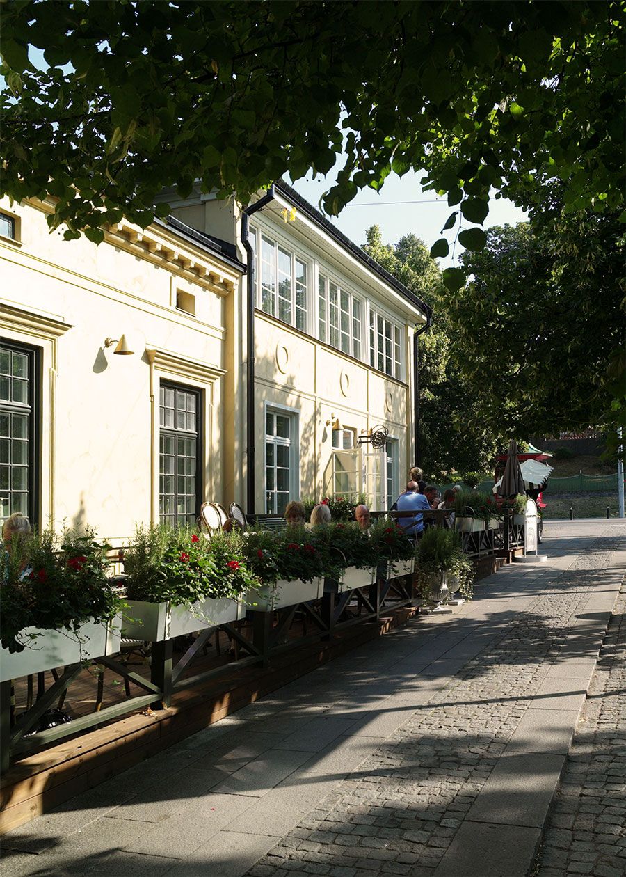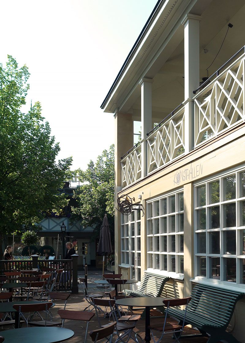 Uteserveringen mot Djurgårdsvägen inramas av ett trästaket utformat efter 1928 års förlaga. Åt Allmänna gränd har uteserveringens stålstaket från sent 1980-tal ersatts med ett lätt trästaket med kryssmotiv.